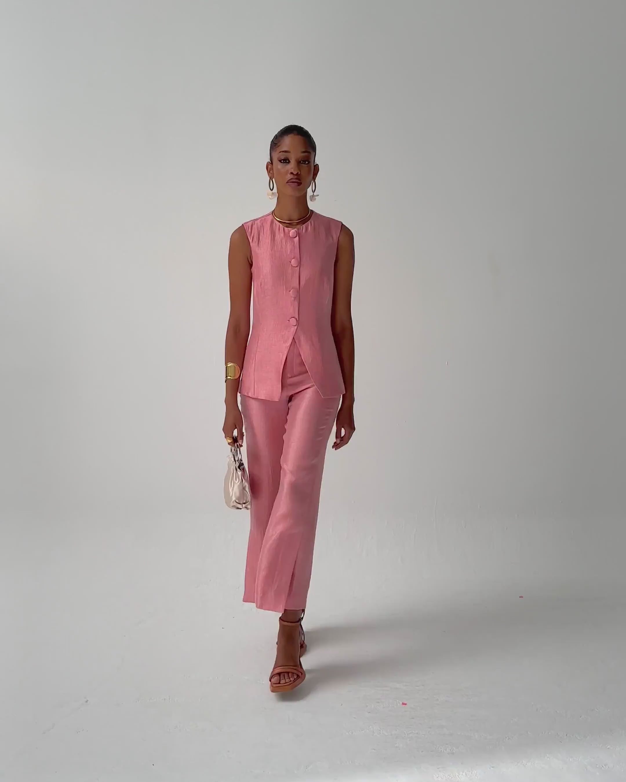 Long-sleeved top with shoulder pads and front fastening with tone-on-tone covered buttons.