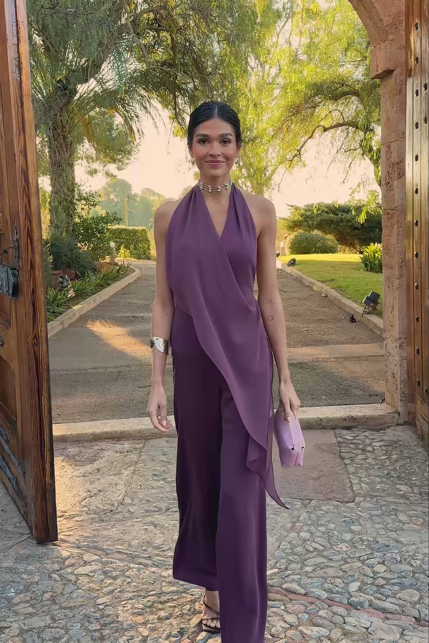 Satin halter neck jumpsuit with asymmetrical overlay chiffon detail. Wide maxi pants.