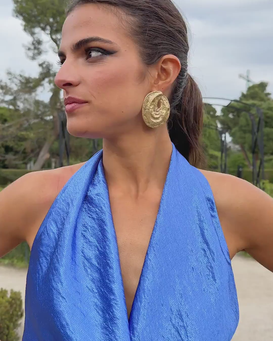 Full-length jumpsuit with a halter neckline and an open back.