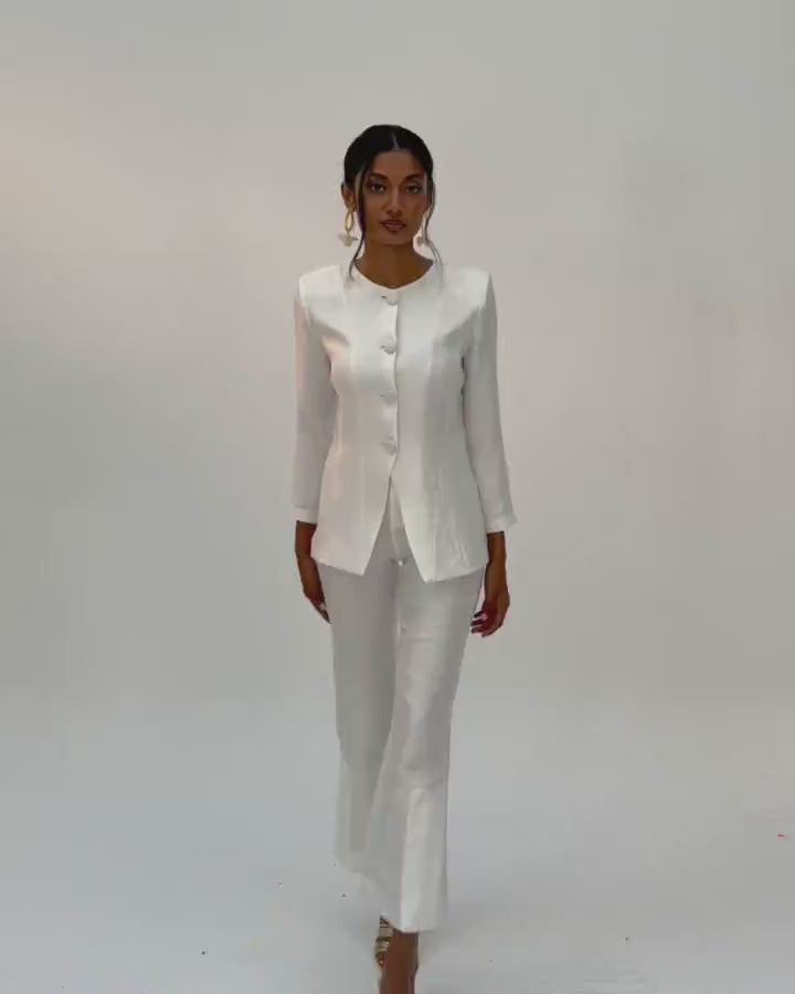 Straight high-waisted trousers with side slits and front zip fastening.