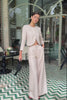 High-waisted trousers with front pleats and wide legs. Textured fabric detail.