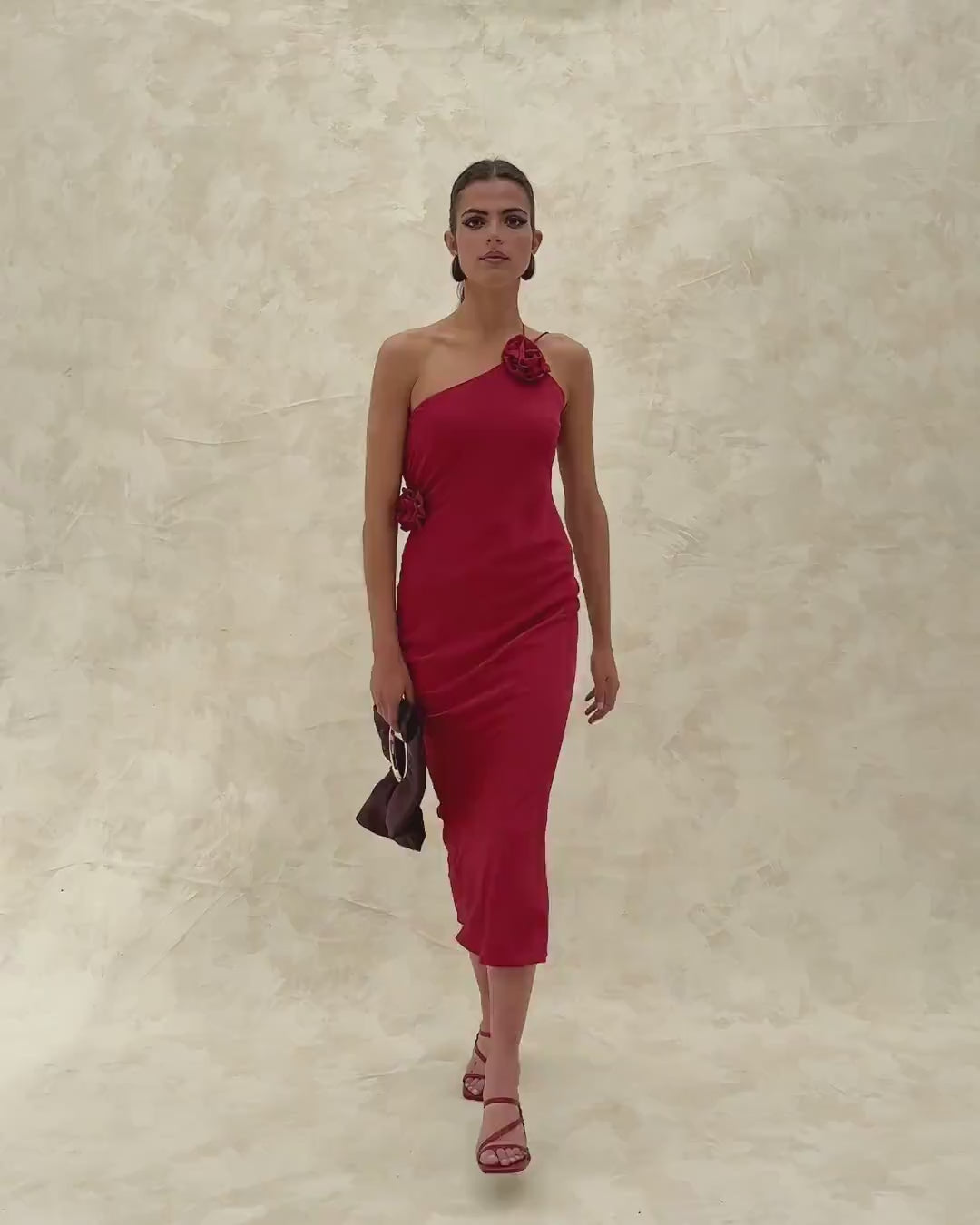 Midi dress with thin straps, asymmetric neckline, open back and flower detail.