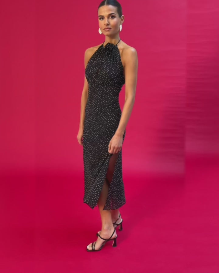 Midi dress a lace-up halterneck, flower detail on the chest, open back and side slit.