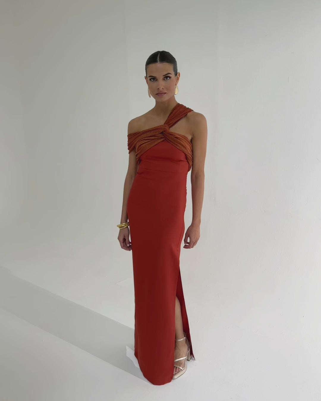 Maxi dress with a knot detail on the front, Bardot neckline and side slit.