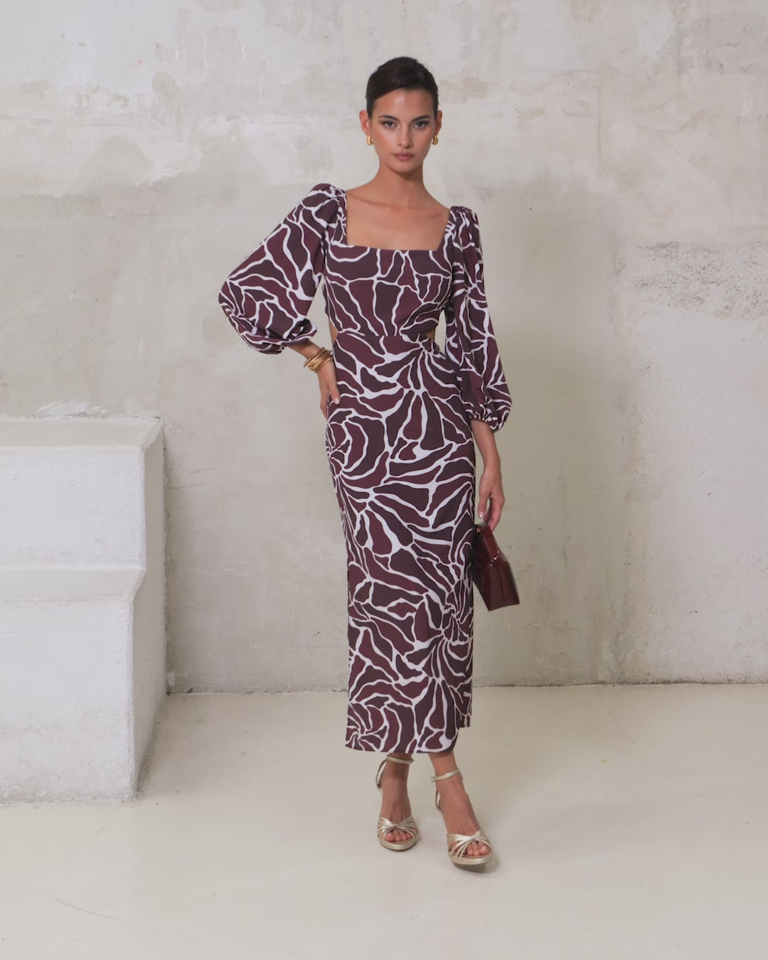 Square-neck midi dress with puffed sleeves and an open, lace-up back.
