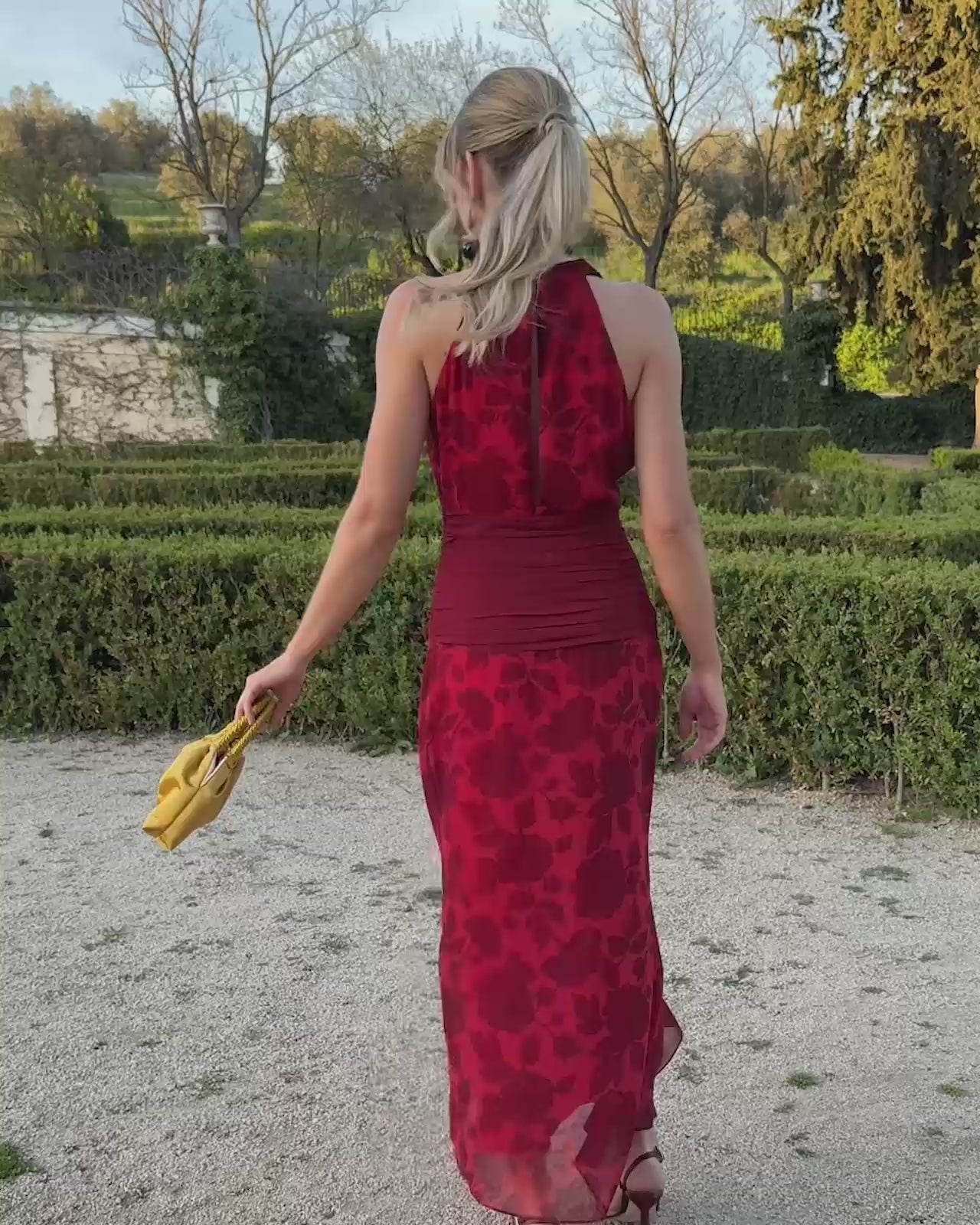 Long dress with halter neck and matching chiffon detail on the skirt for movement.