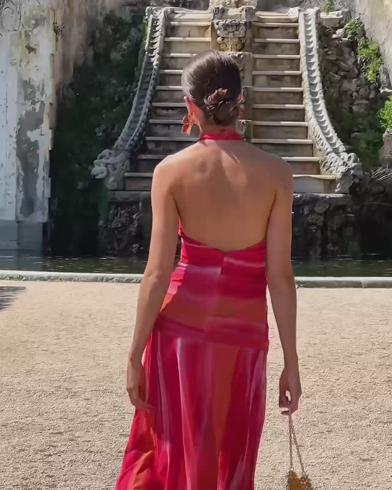 Gathered halter neckline midi dress with central gathers and straight skirt.