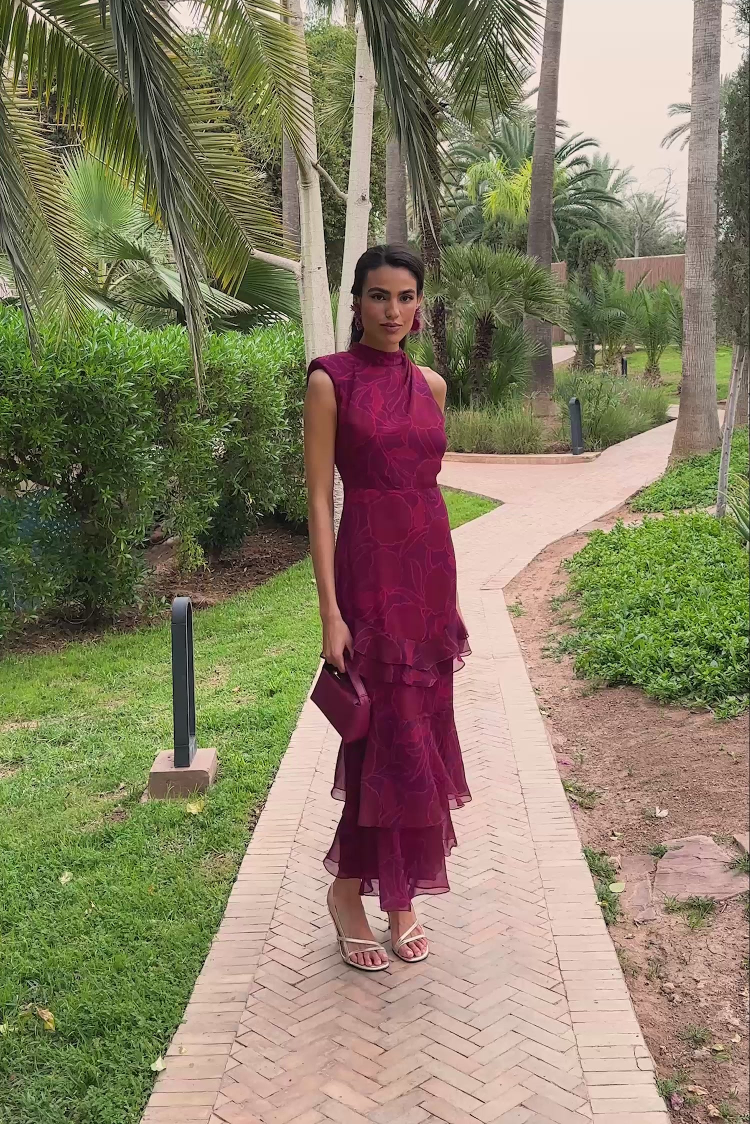 Midi dress with high neck and draped bodice at the front. Flowing skirt with layered ruffles.