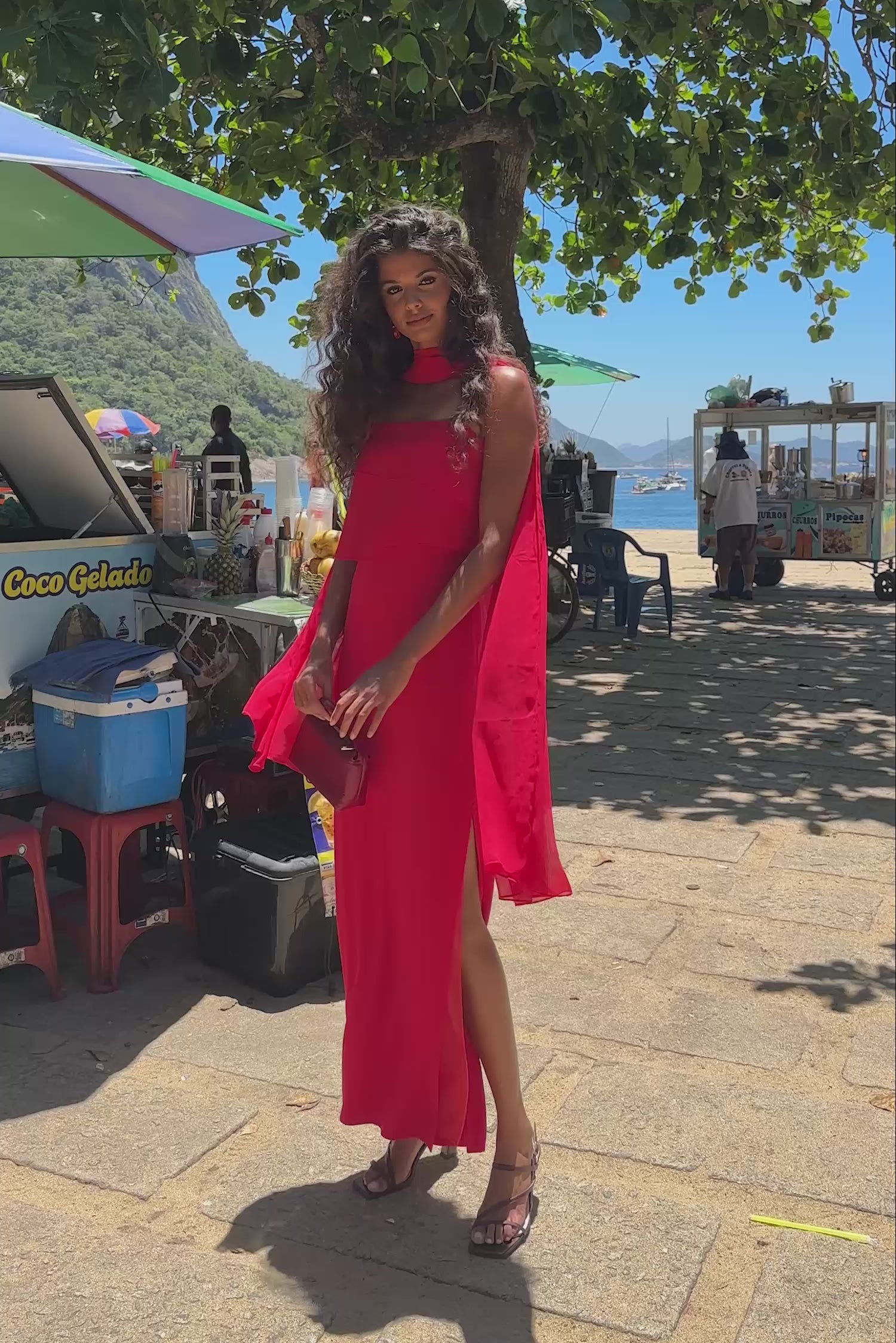 Long dress with thin straps. Flowing chiffon overlay top. Straight neckline and fitted skirt with side slit.