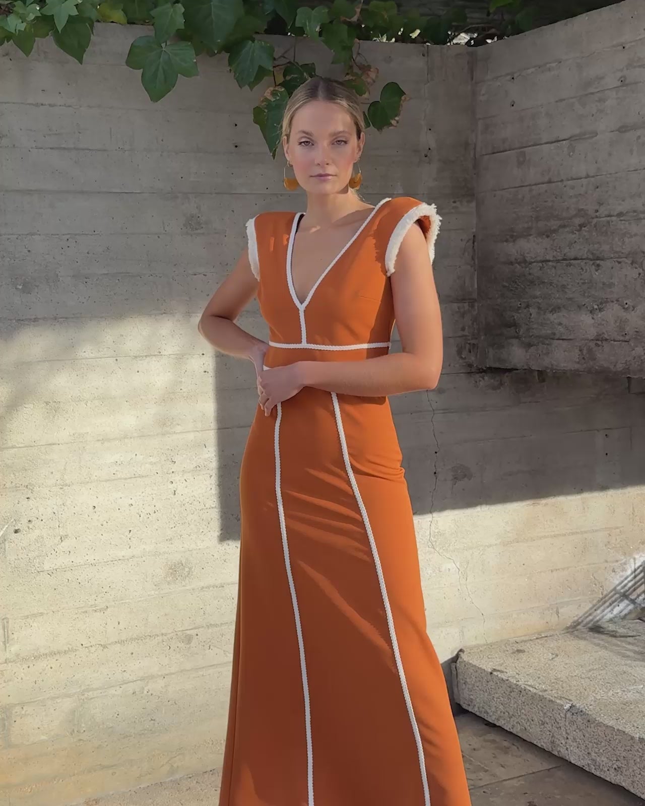 Midi dress with shoulder pads, cut at the waist and evasé skirt with cotton ribbon detail.