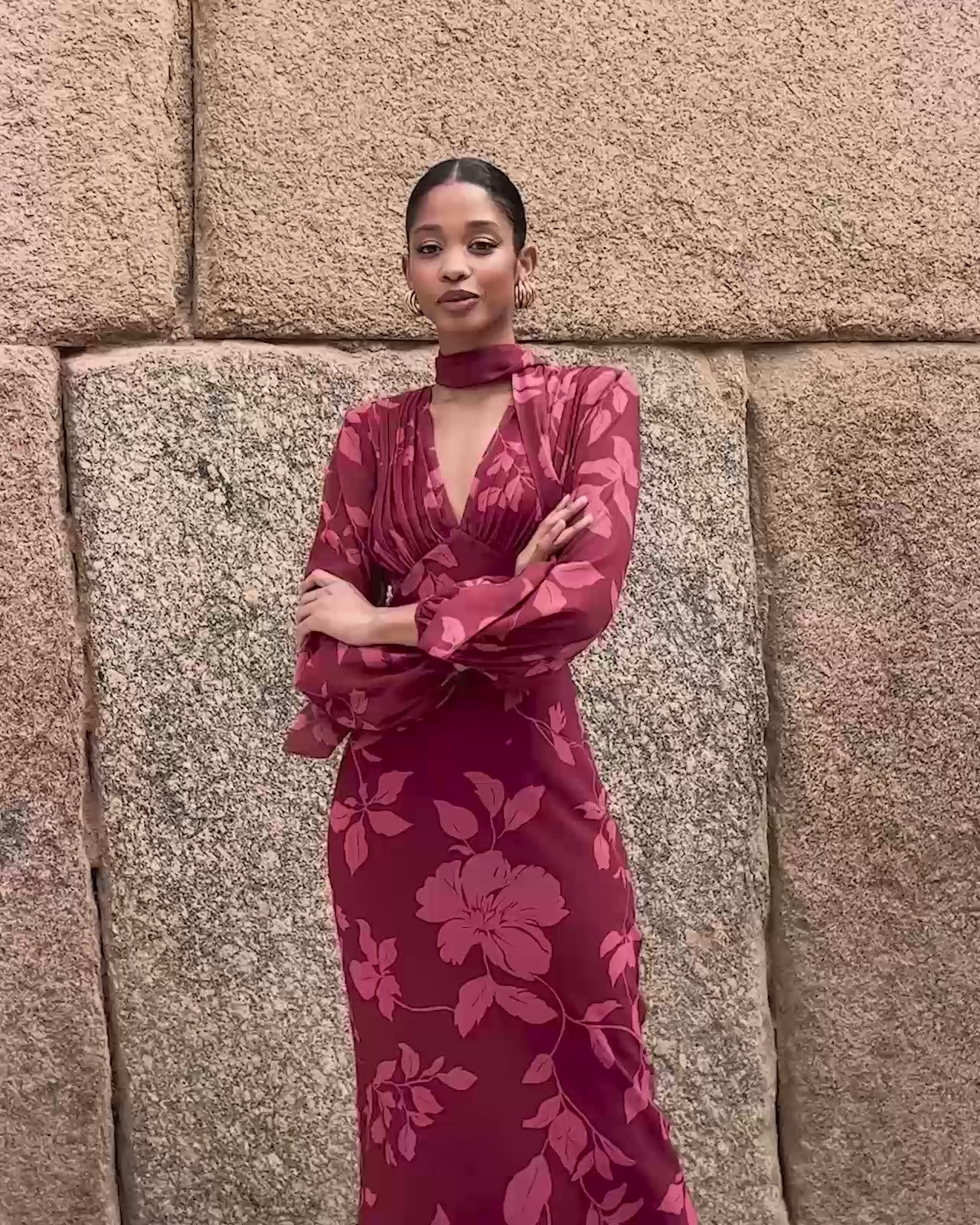 Midi dress with a V-neck, ruching, puffed sleeves and a scarf detail at the neck.