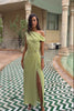 Long dress with asymmetrical neckline. Side draping with gold detail at the waist and skirt with front slit.