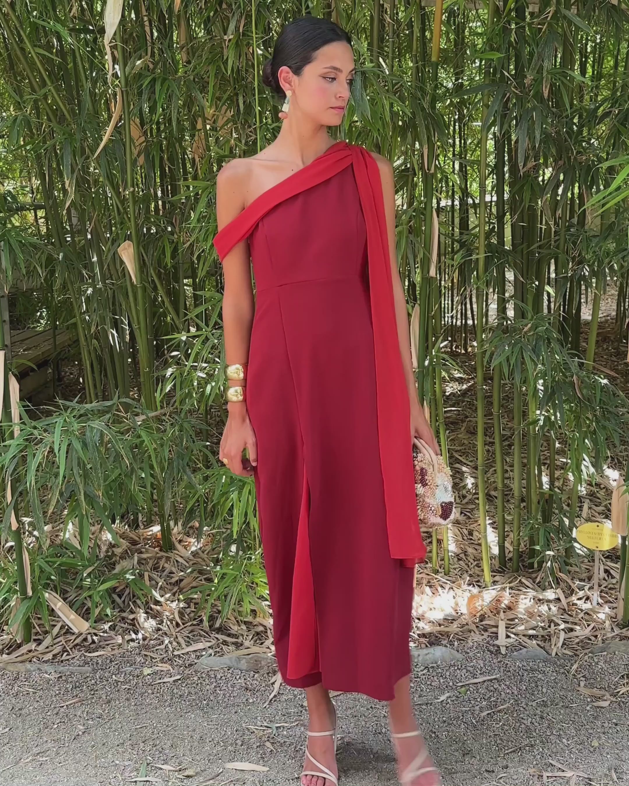 Two-tone midi dress with asymmetric bardot neckline, lace on the shoulder and a side slit with chiffon detail.
