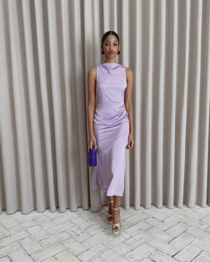 Midi dress with an asymmetrical skirt with light flounces to give it movement and a teardrop cut-out detail on the back.