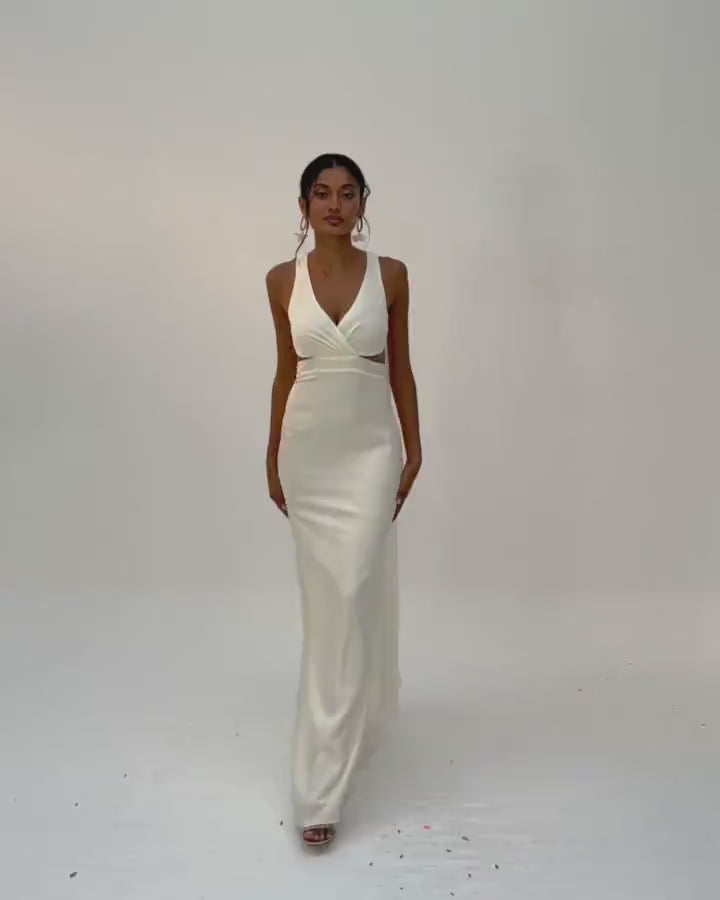 Flowy maxi dress with plunging V-neck, cut-out details and layers on the back of each shoulder strap.