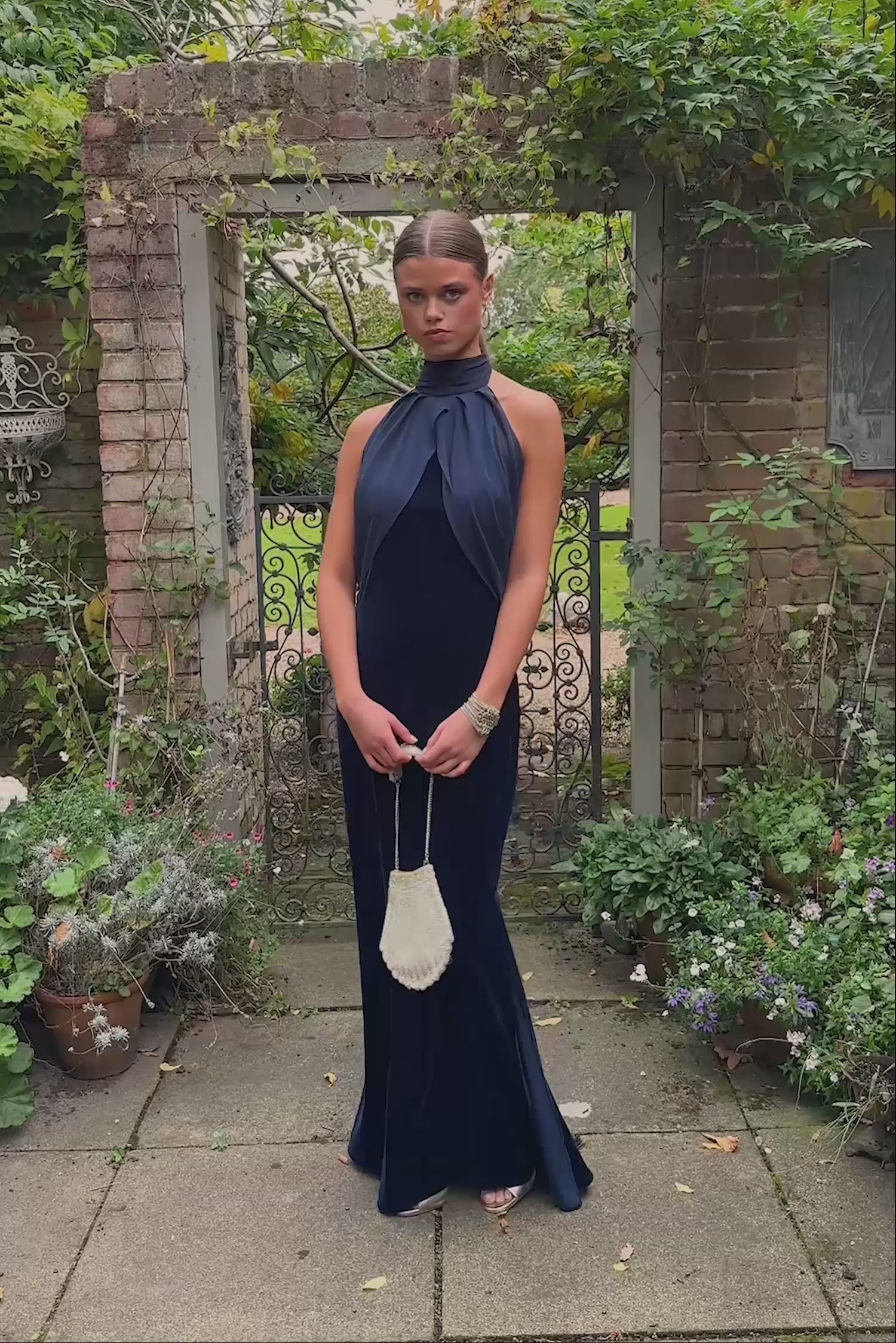 Long dress with halter neckline, open back and overlay chiffon cape detail at the top.