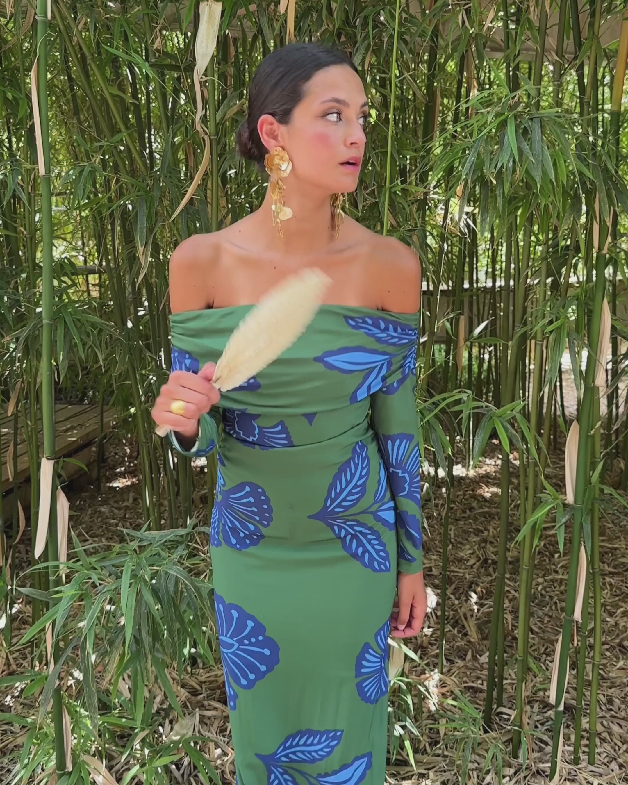 Long dress with bardot neckline and long sleeves.