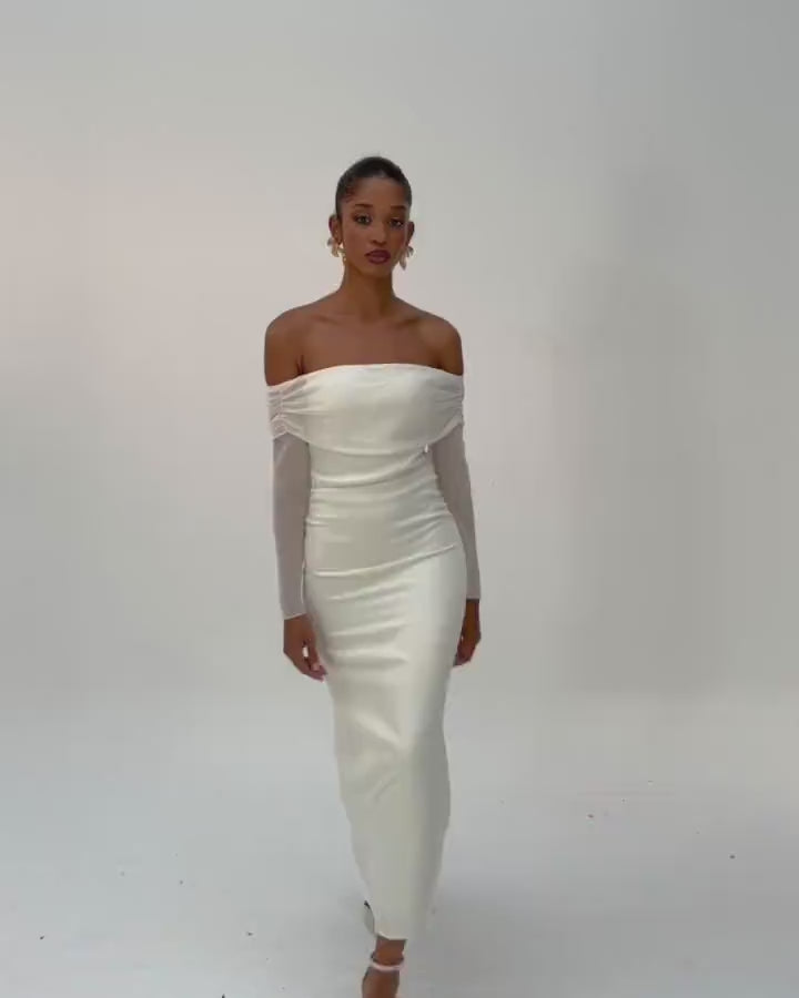 Long dress with bardot neckline and long sleeves.