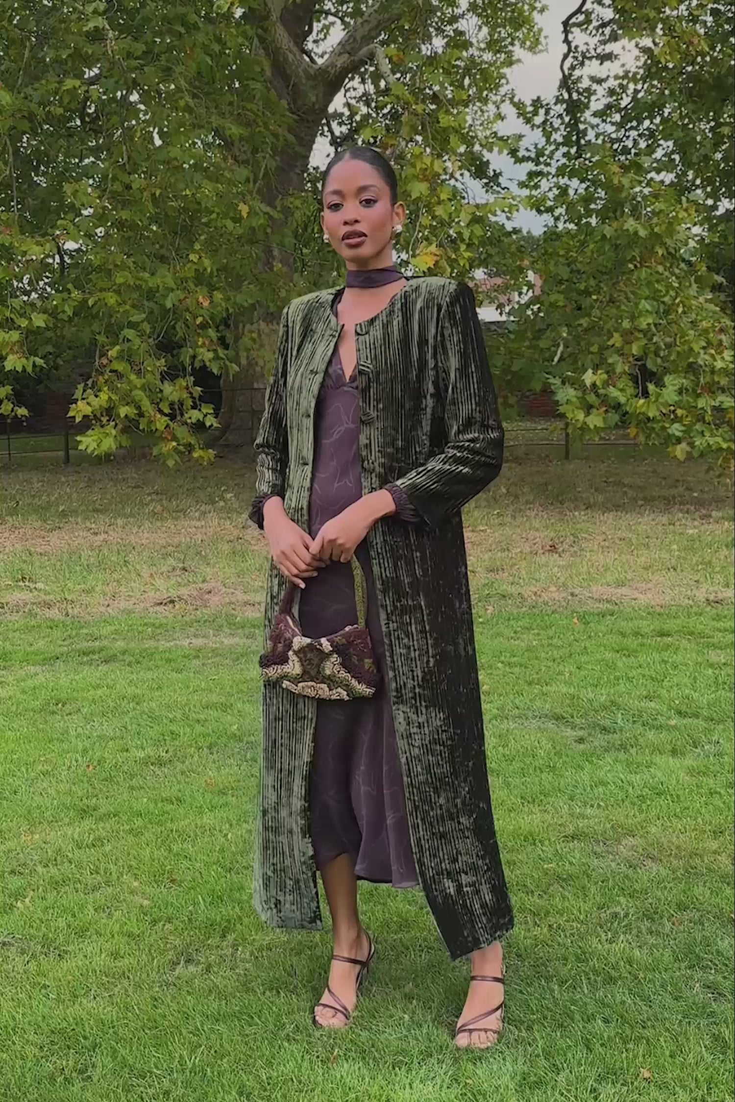 Manteau long à col rond avec fermeture à boutons sur le devant.