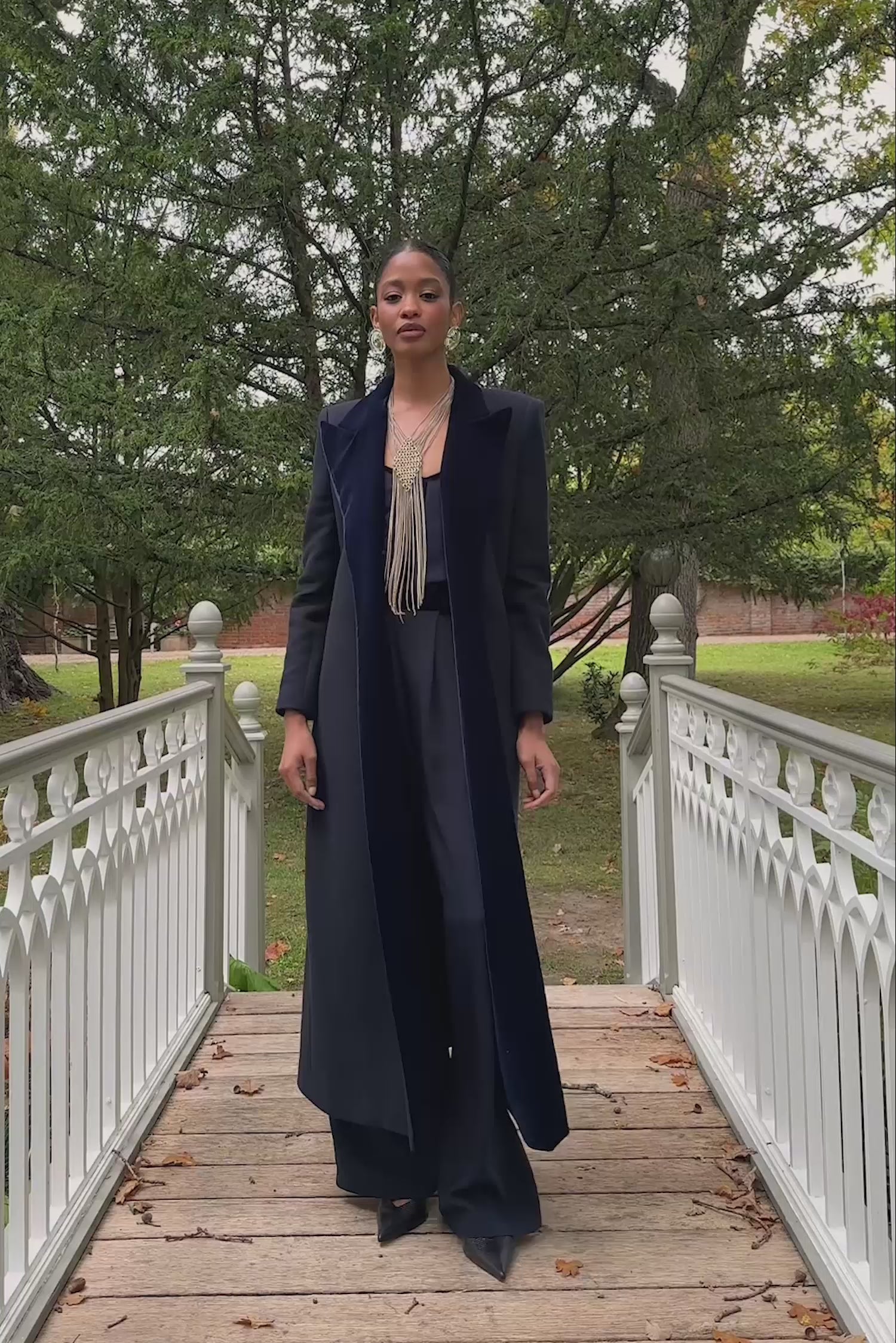 Manteau long avec détail en velours sur le devant et fermeture centrale dissimulée.