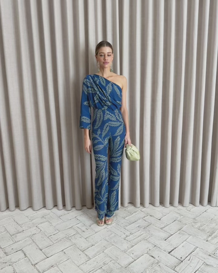 Combinaison longue asymétrique drapée sur le devant.