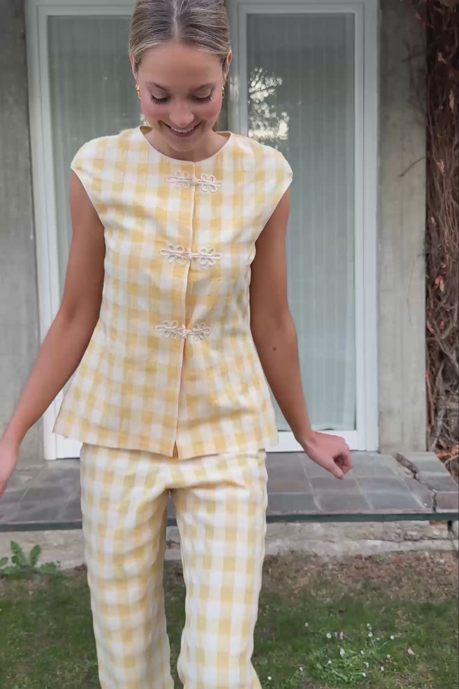 Top à manches courtes, marqué à la taille par un passepoil et des œillets.