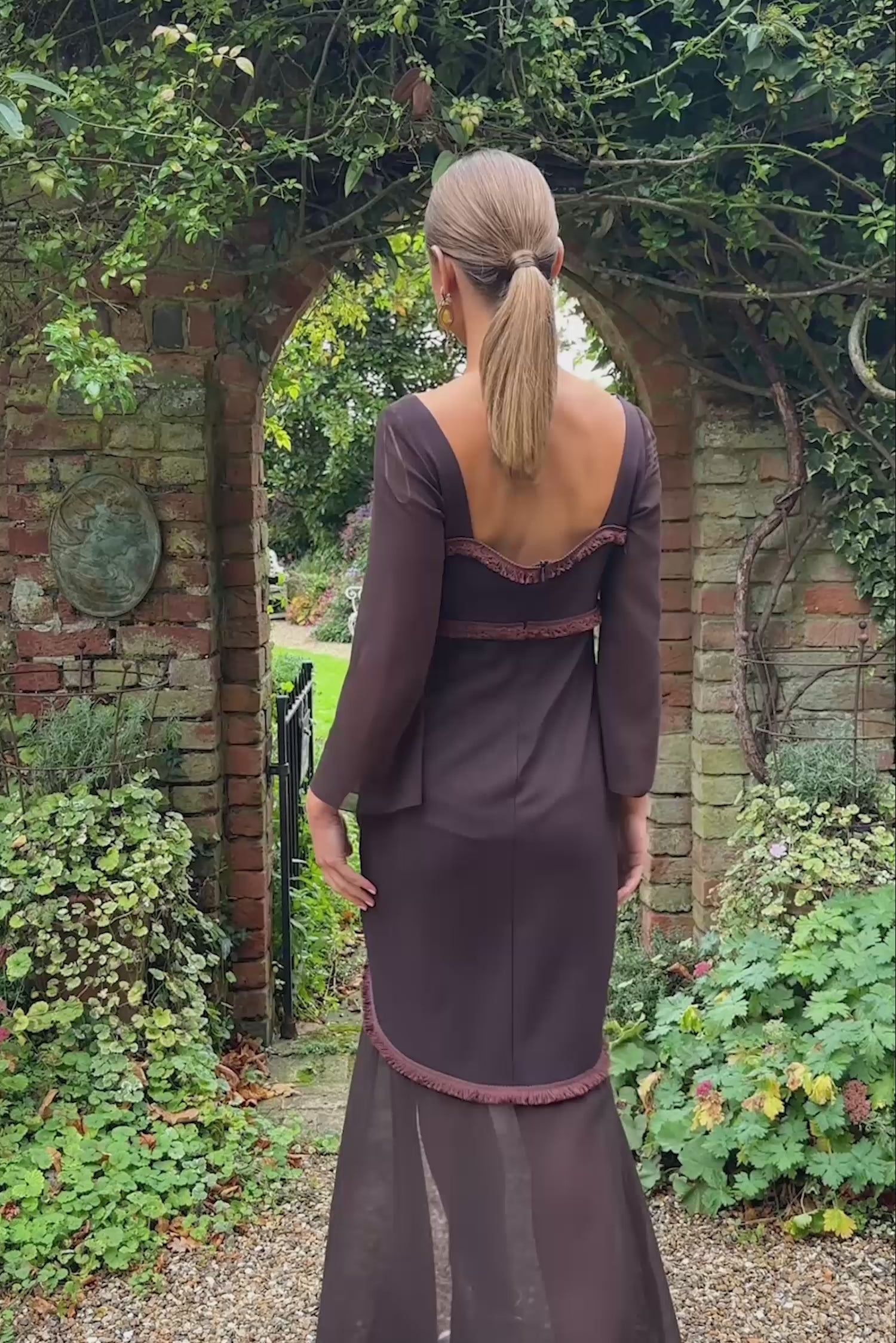 Robe longue avec encolure en cœur, combinée avec de la mousseline sur l'ourlet et les manches et des franges contrastées.