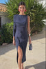 Robe midi asymétrique à manches longues. Fente sur le devant de la jupe. Ceinture assortie incluse.