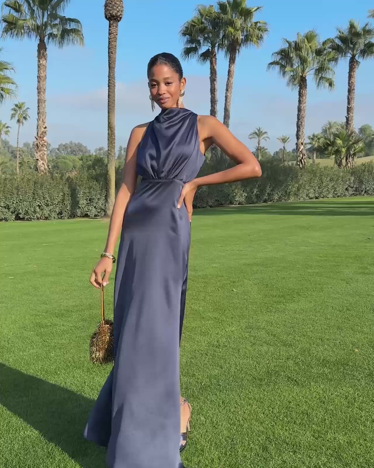 Robe longue avec encolure licou froncée et dos avec détail en forme de goutte.