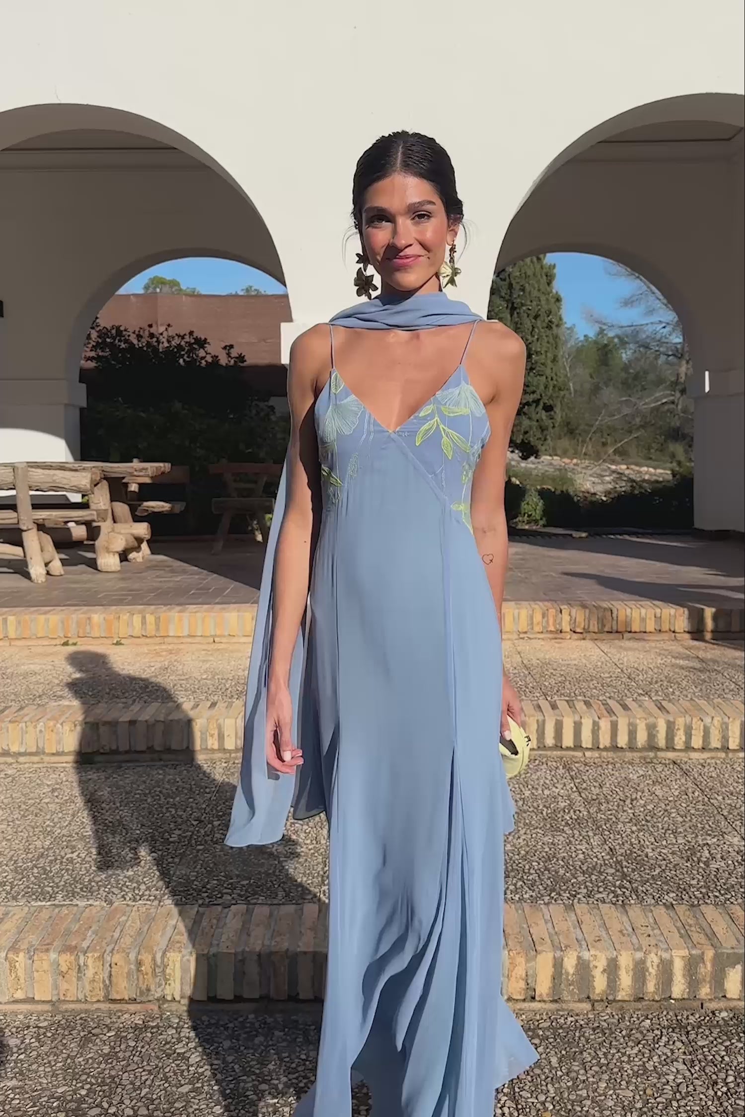Robe longue avec décolleté en V. Haut en dentelle avec bretelles fines et dos nu. Jupe en mousseline avec plis.
