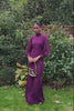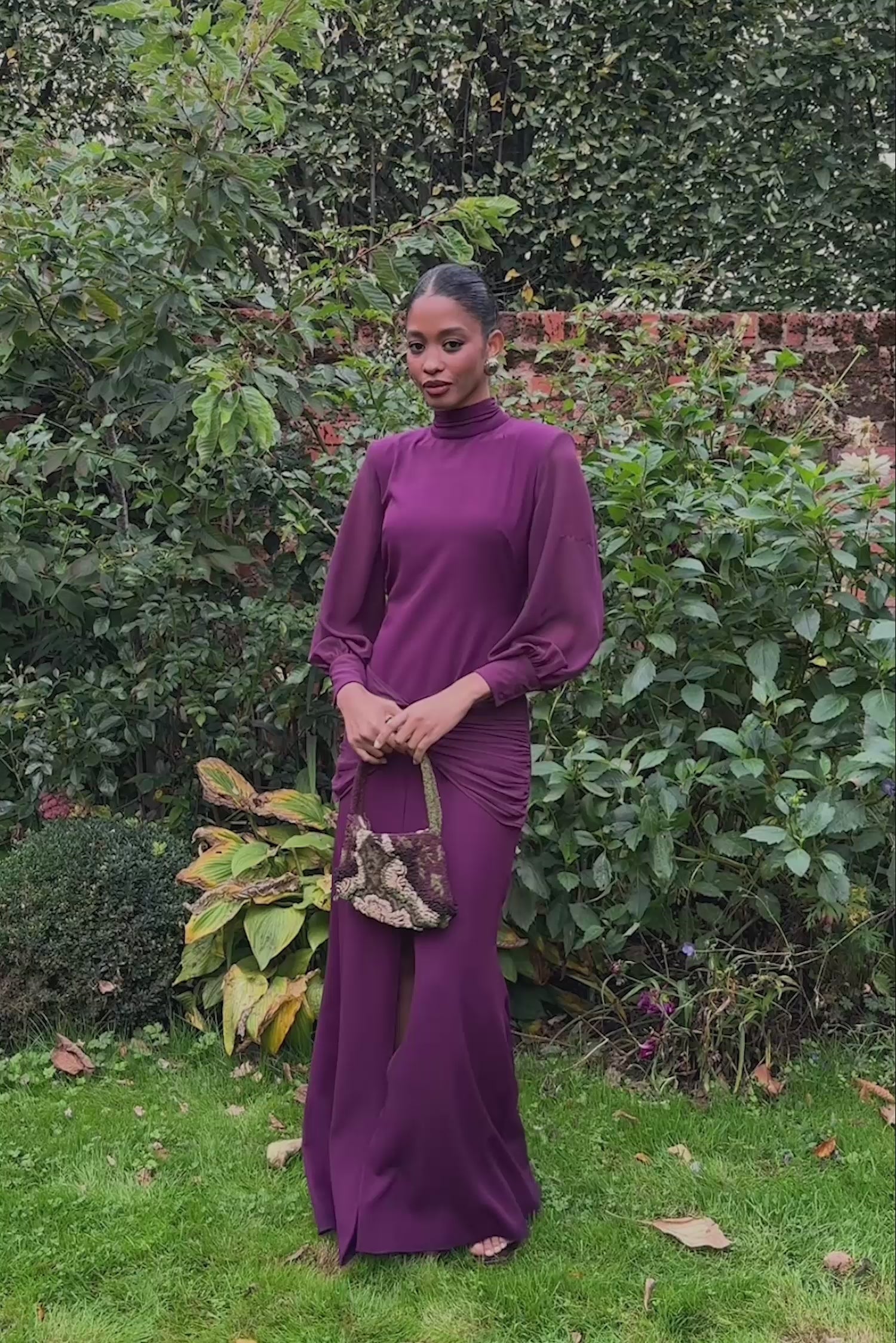 Robe longue à manches bouffantes, fronces sur les hanches et dos nu.