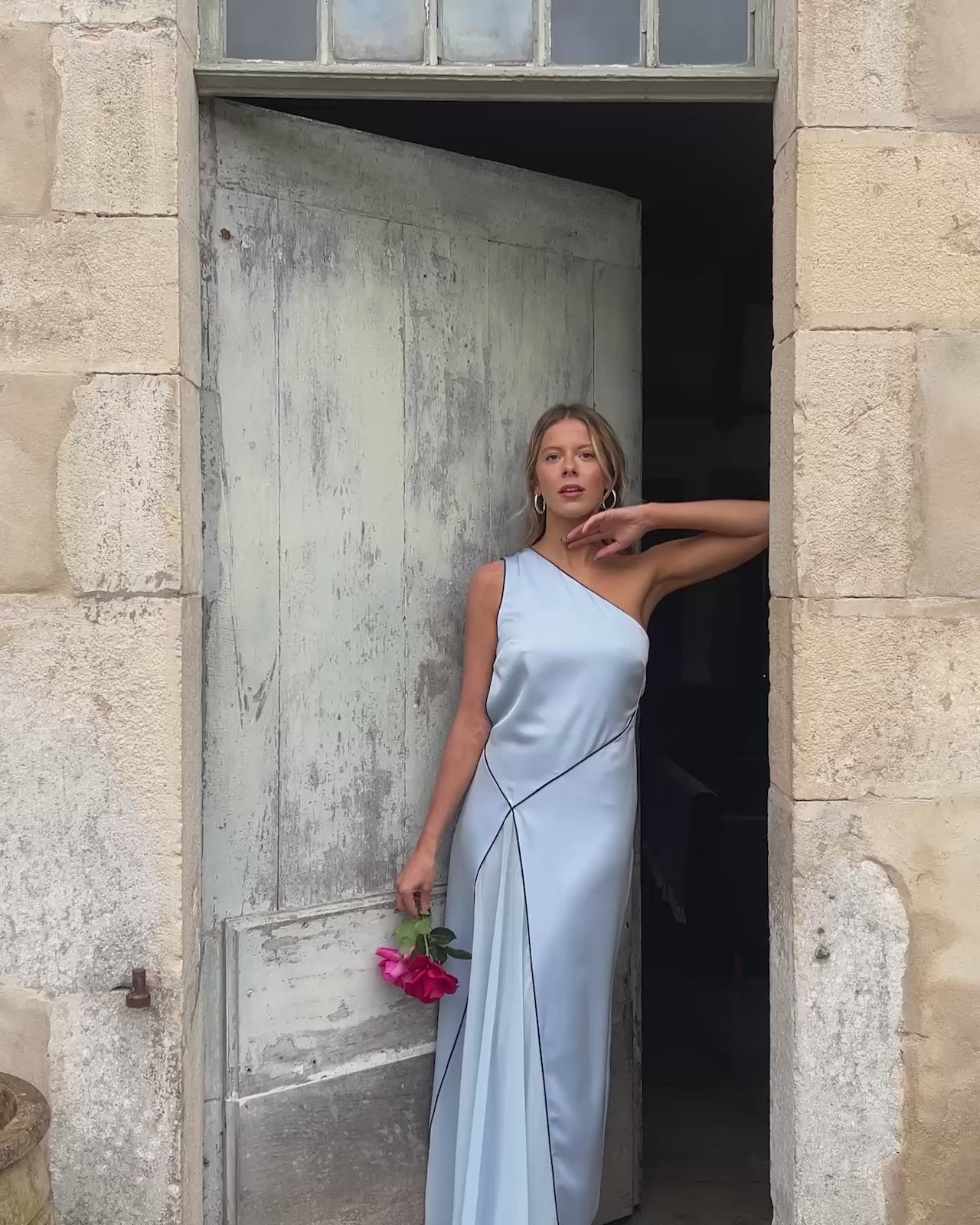 Robe longue asymétrique avec dos ouvert et jupe quille en mousseline de soie assortie.
