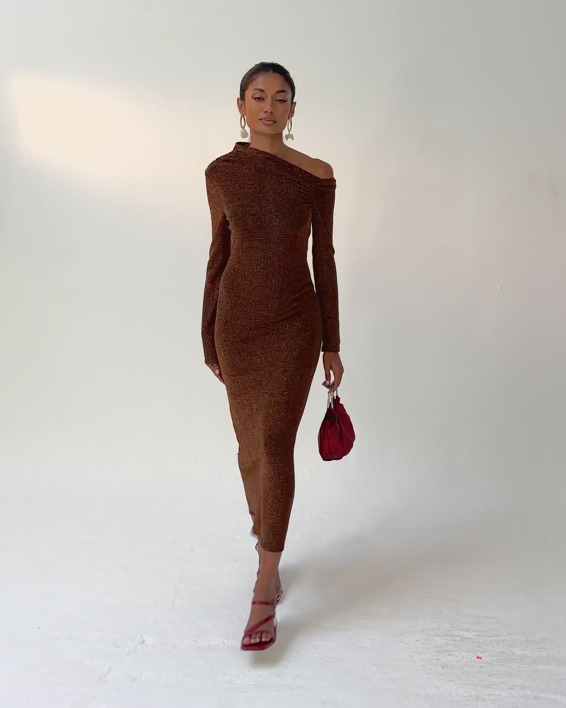 Robe midi ajustée à manches longues avec encolure bardot asymétrique.