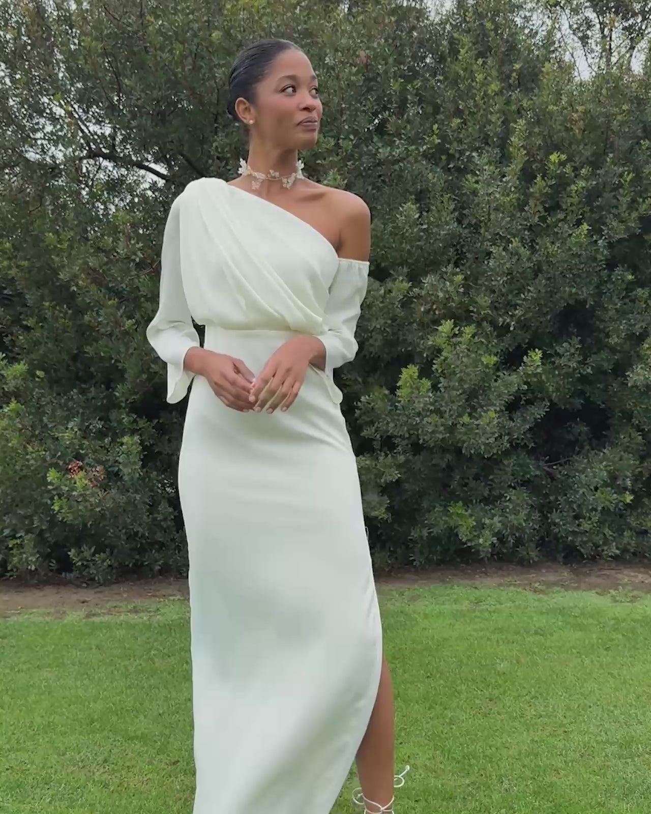 Robe longue à décolleté asymétrique, drapé sur le devant et ouverture latérale.