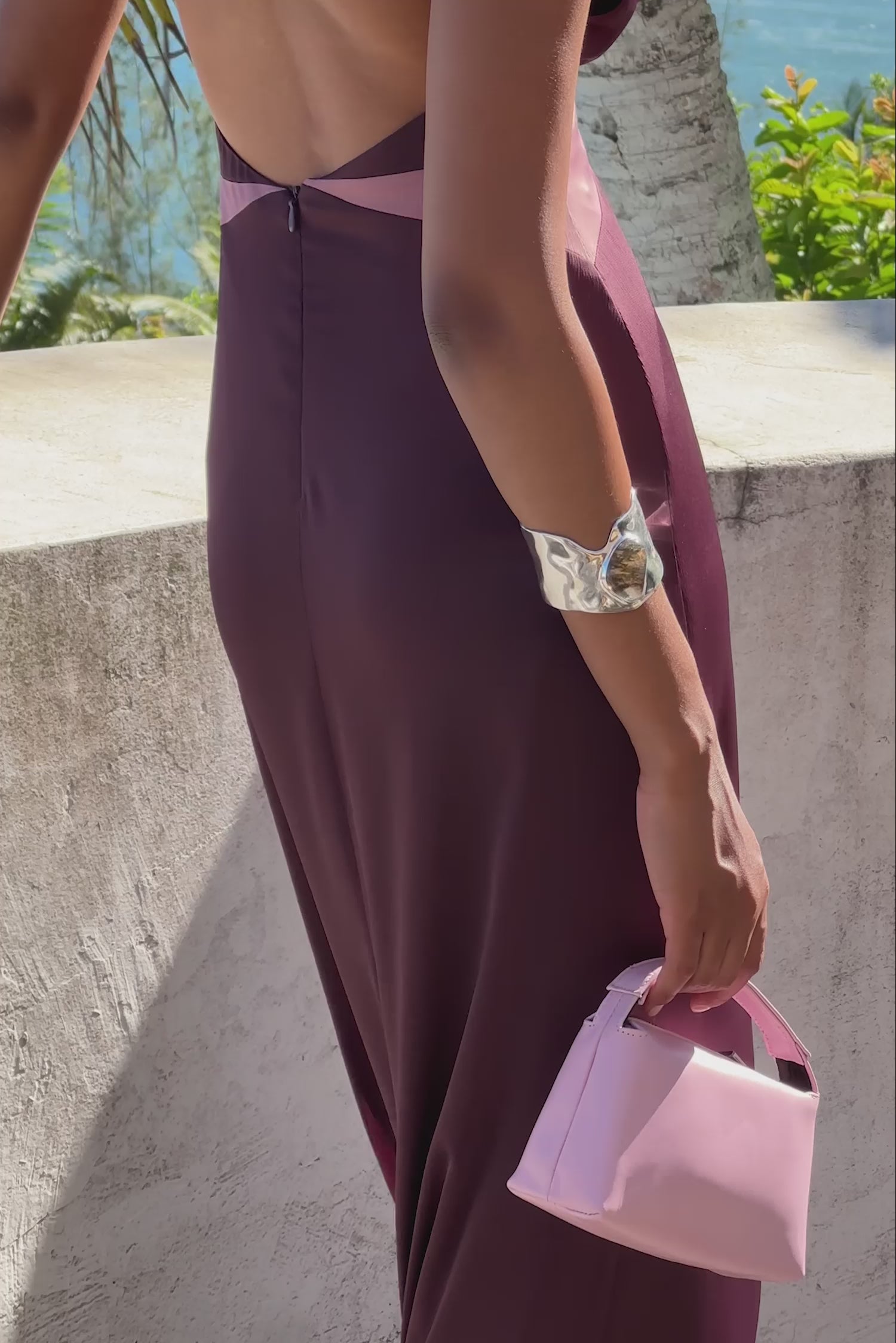 Bolso rectangular pequeño con asa de mano y cierre con cremallera.