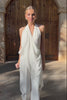 Mono satinado de cuello halter con detalle de gasa asimétrica superpuesta. Pantalón ancho maxi.
