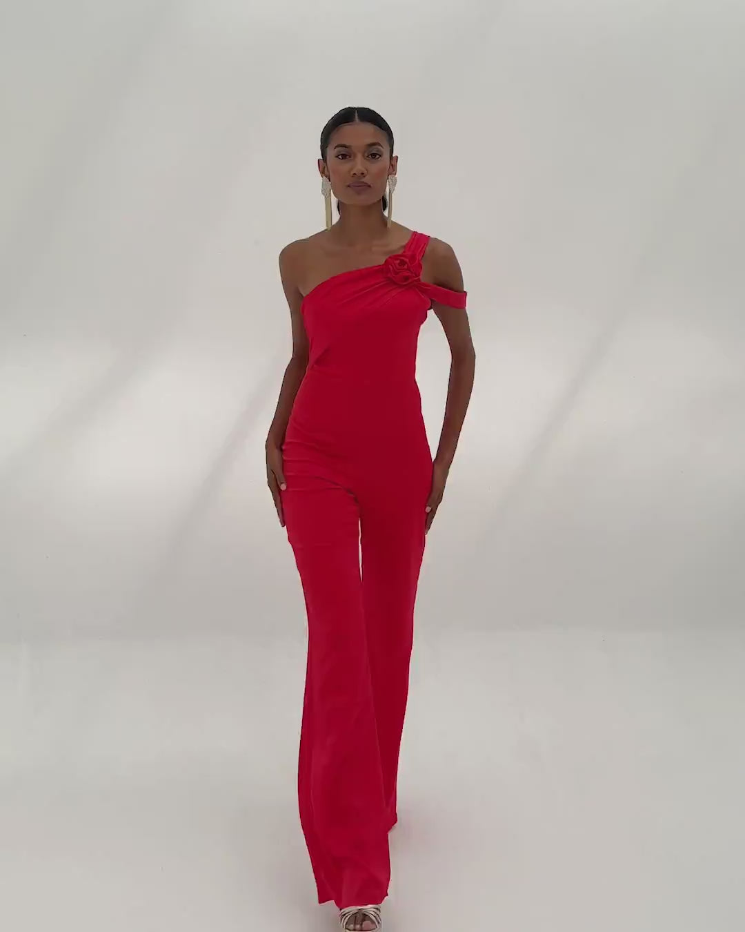 Mono largo con escote asimétrico y detalle de flor en el pecho.