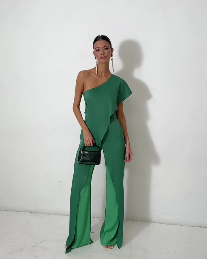 Mono largo fluido bicolor con manga asimétrica y capa delantera de gasa.