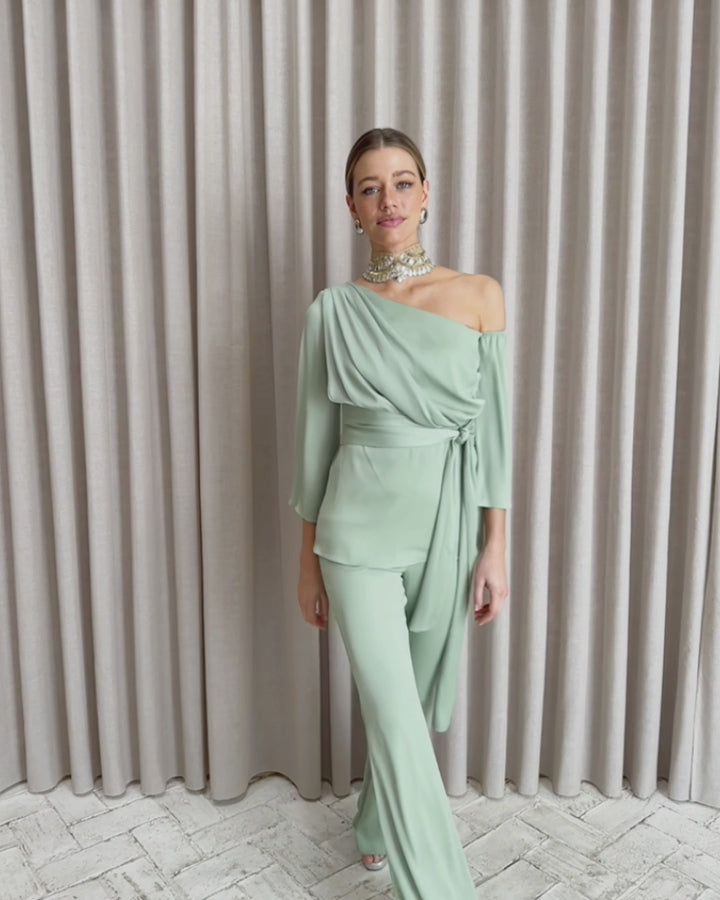 Pantalón acampanado de talle alto con cinturilla de goma en la parte trasera y cremallera lateral.