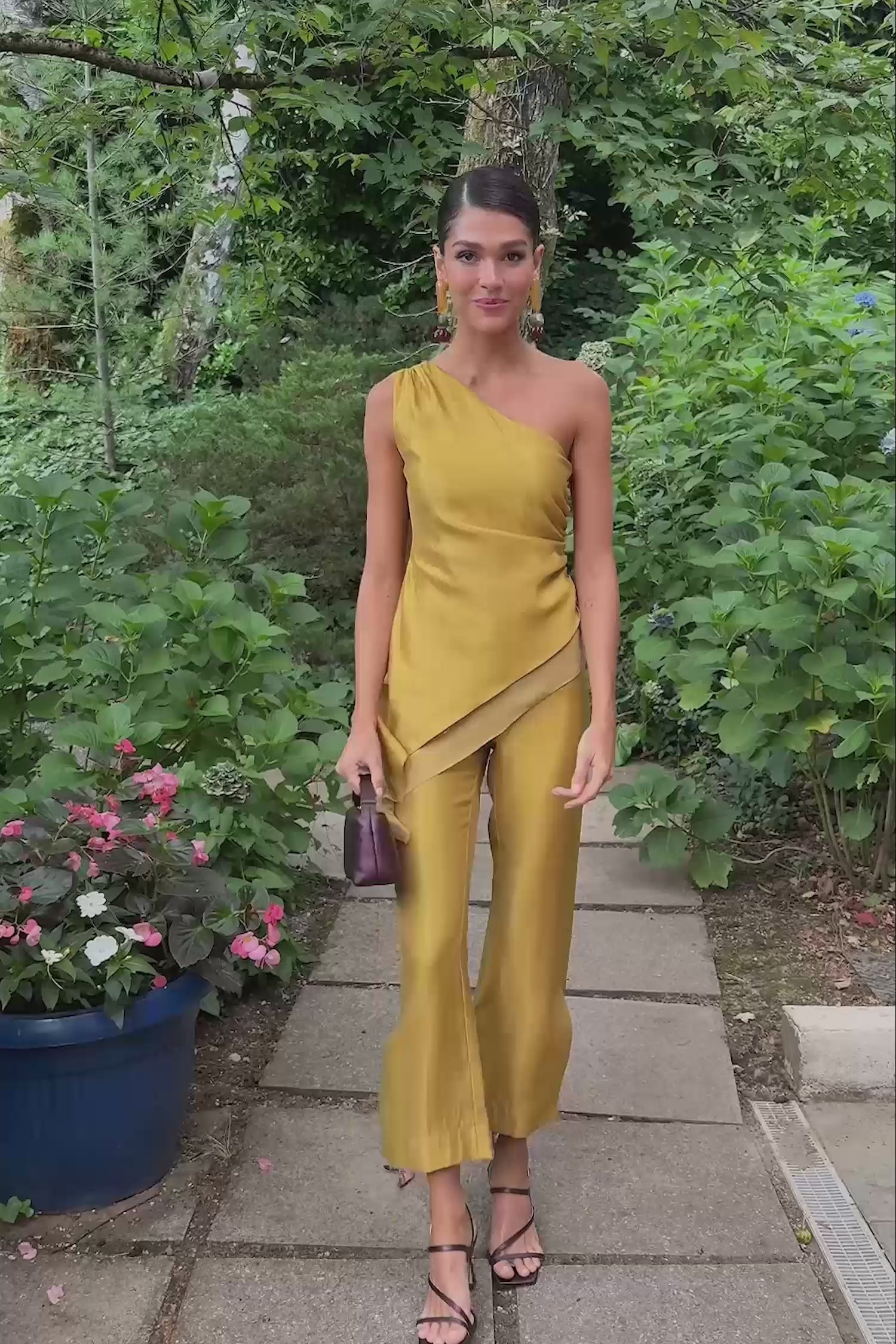Top asimétrico con detalle de drapeado en el lateral. Gasa a tono en el bajo y en tirante que sobresale por la espalda.