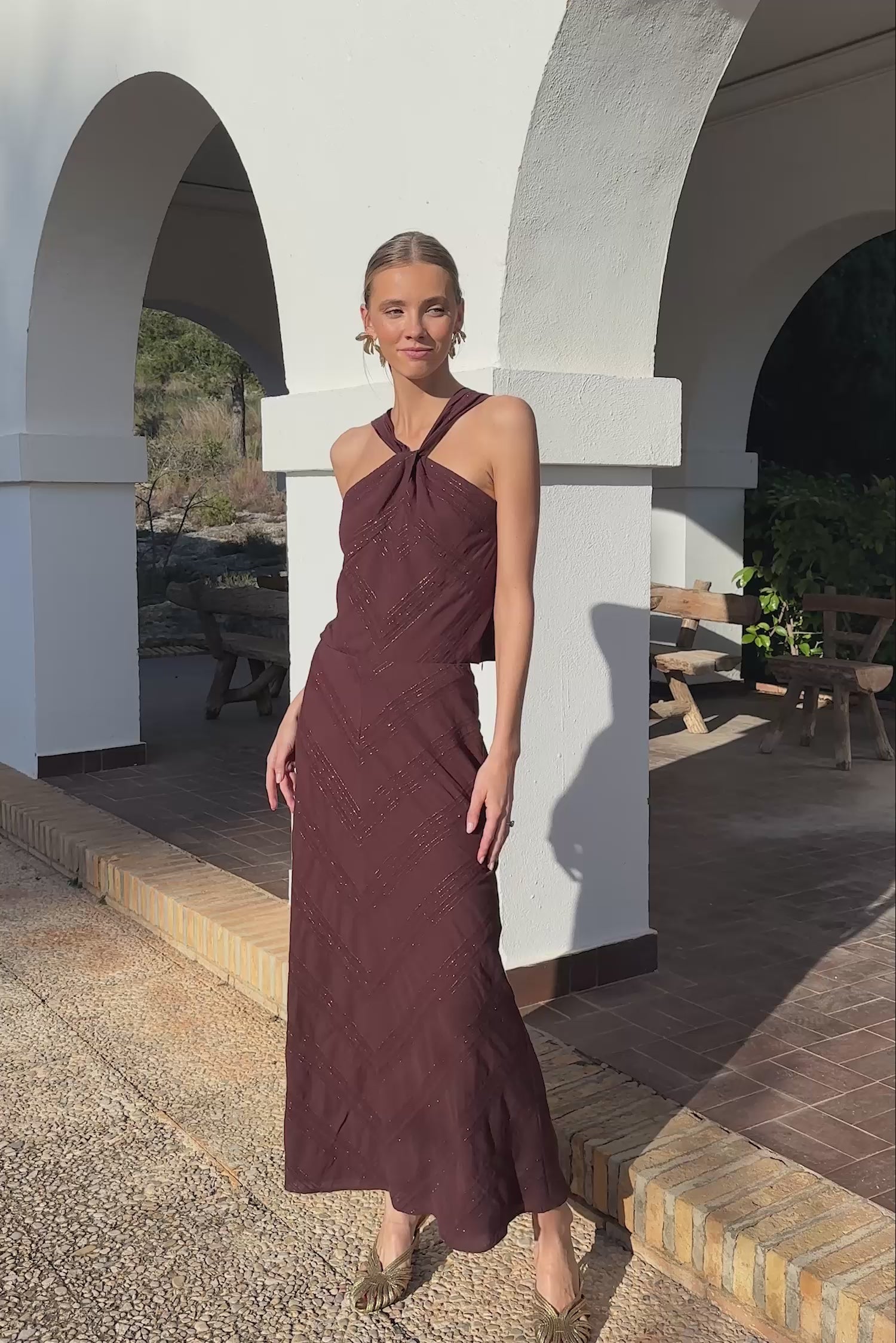 Top cruzado en tejido geométrico y lurex. Cremallera en costado.