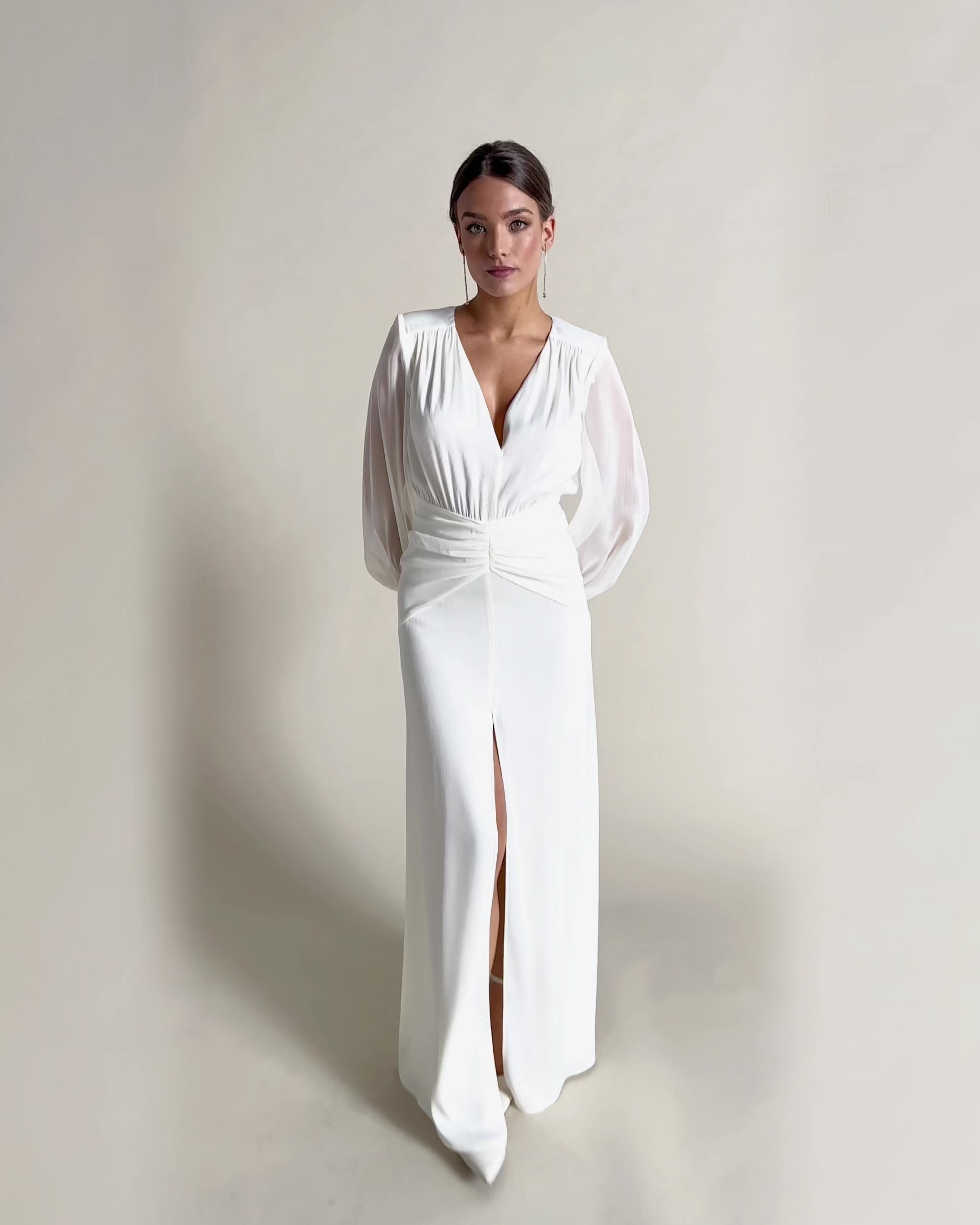 Vestido largo con escote en pico, mangas abullonadas semitransparentes, abertura y frunces en la parte delantera y detalle de lágrima en la espalda.