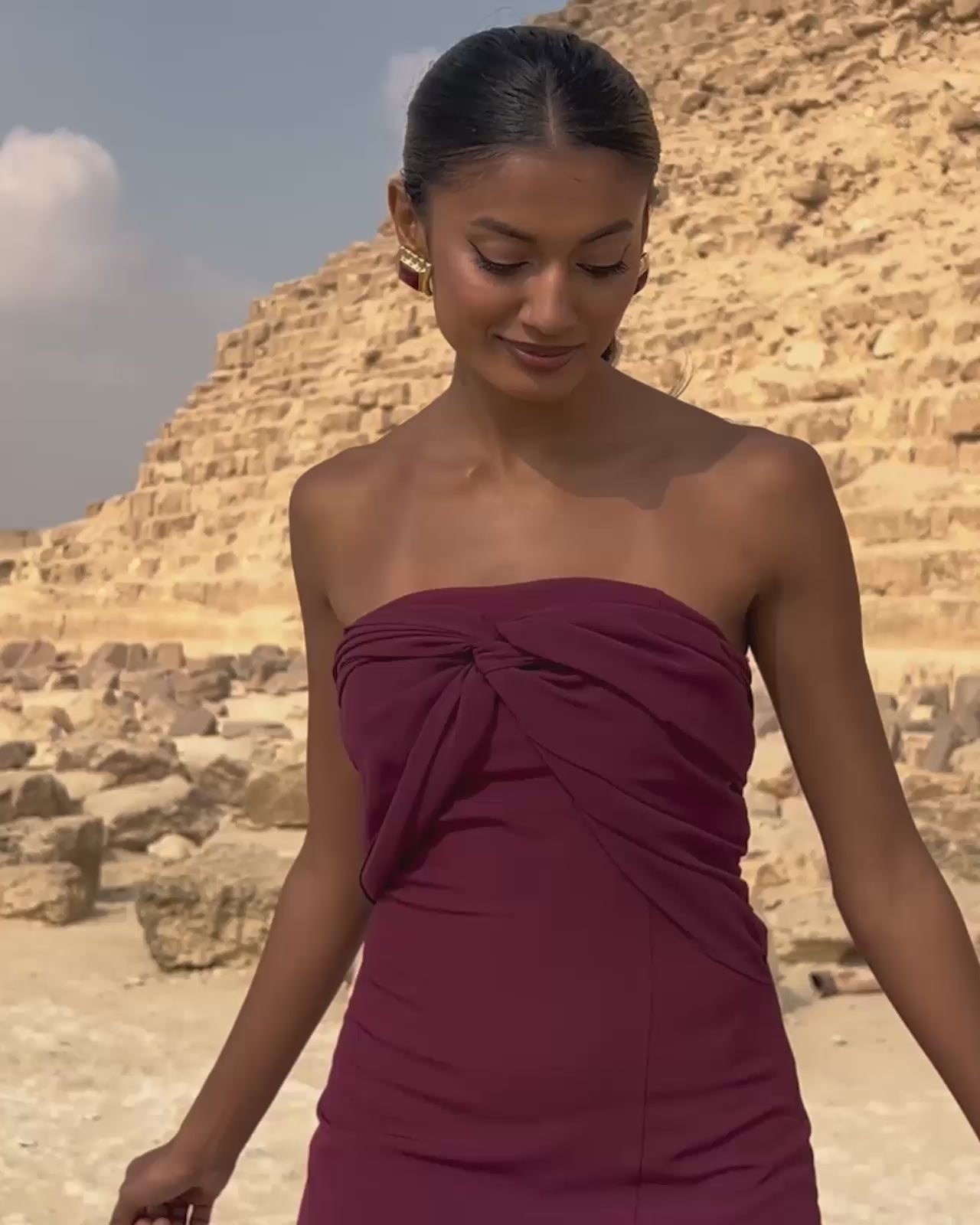 Vestido midi con escote palabra de honor, chal multiposición y falda combinada con gasa para darle movimiento.