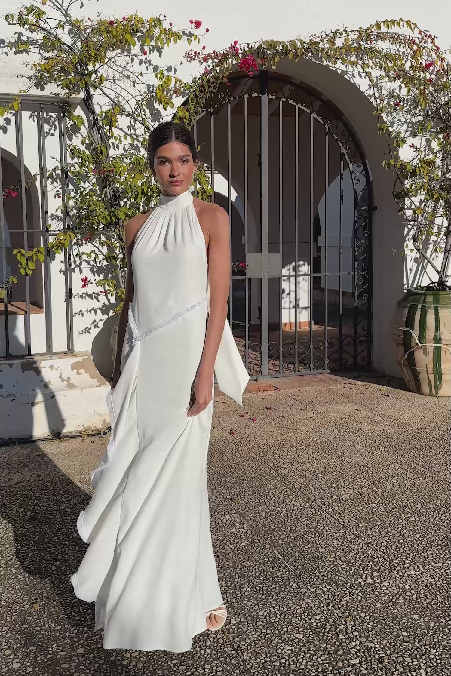 Vestido largo en tejido crepe. Cuello halter con pliegues. Falda asimétrica con detalle de flecos a tono.