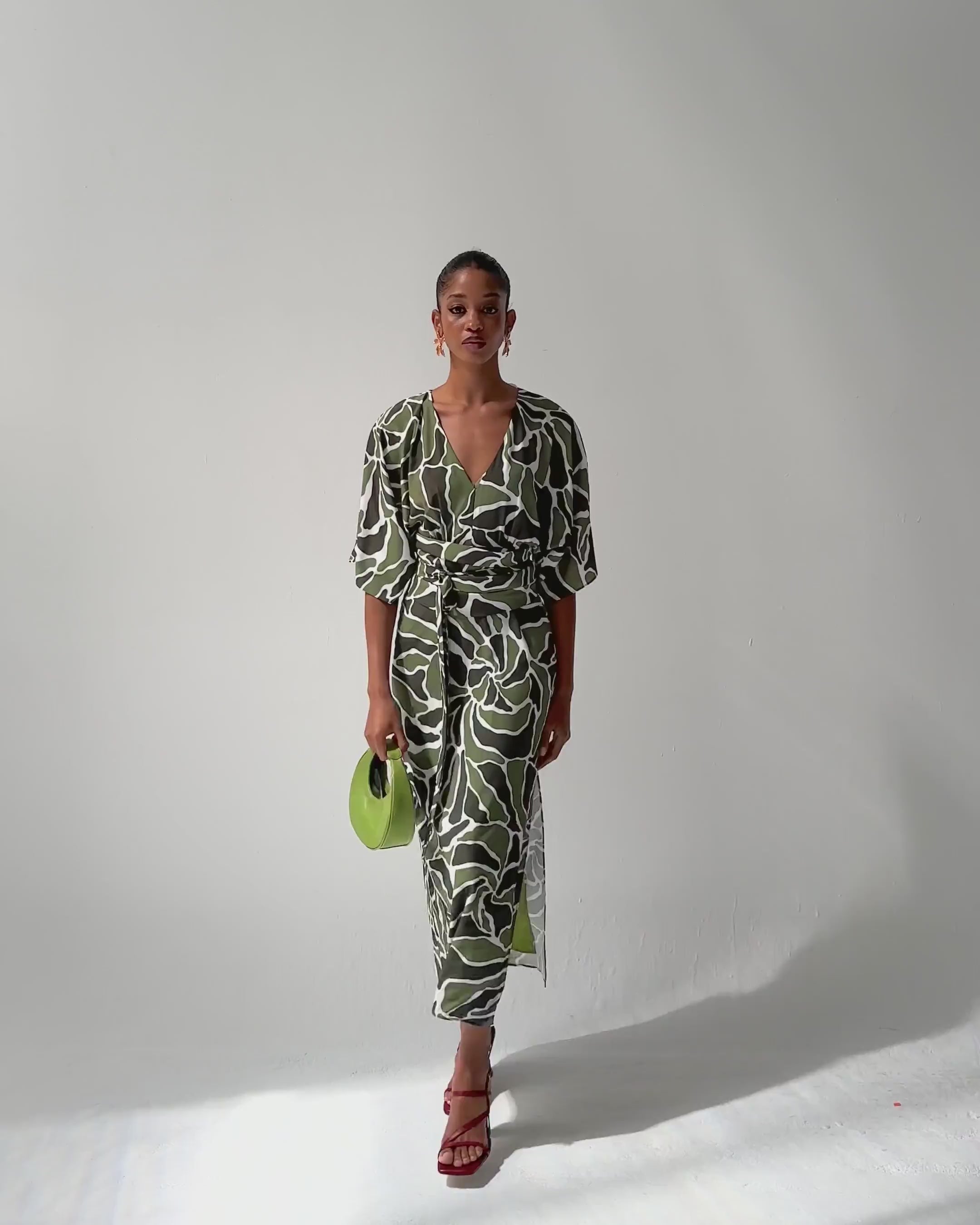 Vestido midi con escote en pico, manga tipo kimono, abertura lateral y fajín con detalle de lazo.