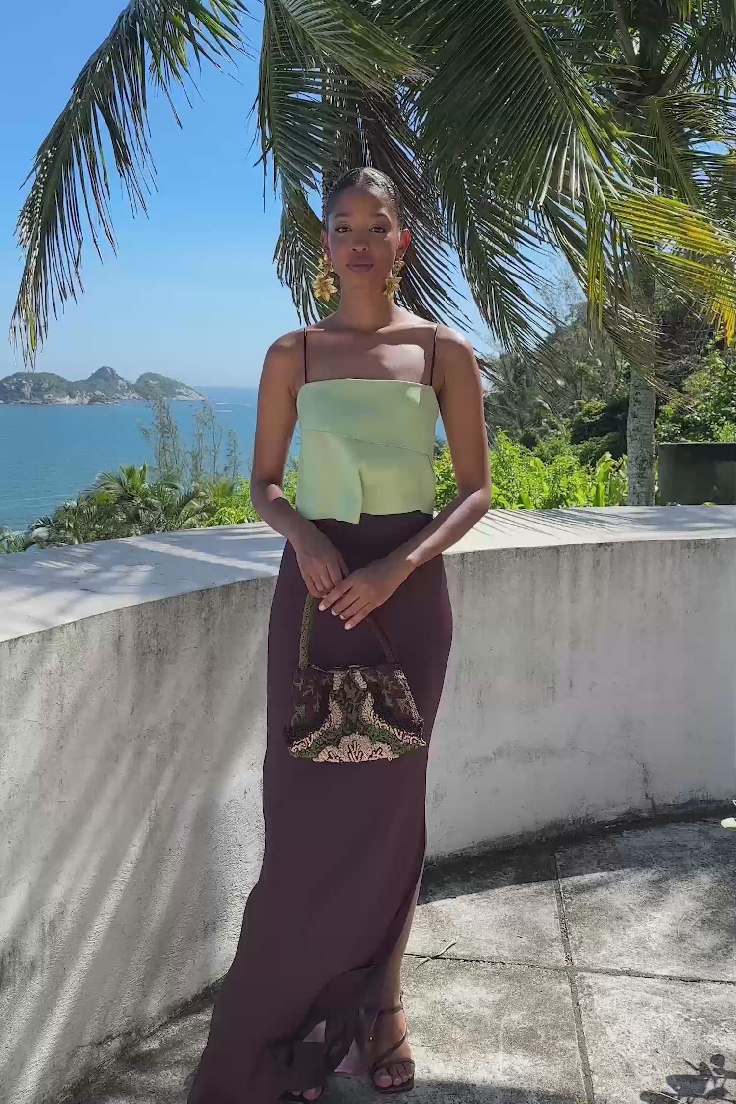 Vestido largo bicolor de tirantes finos. Top fluido superpuesto en gasa. Escote recto y falda ajustada con abertura lateral.