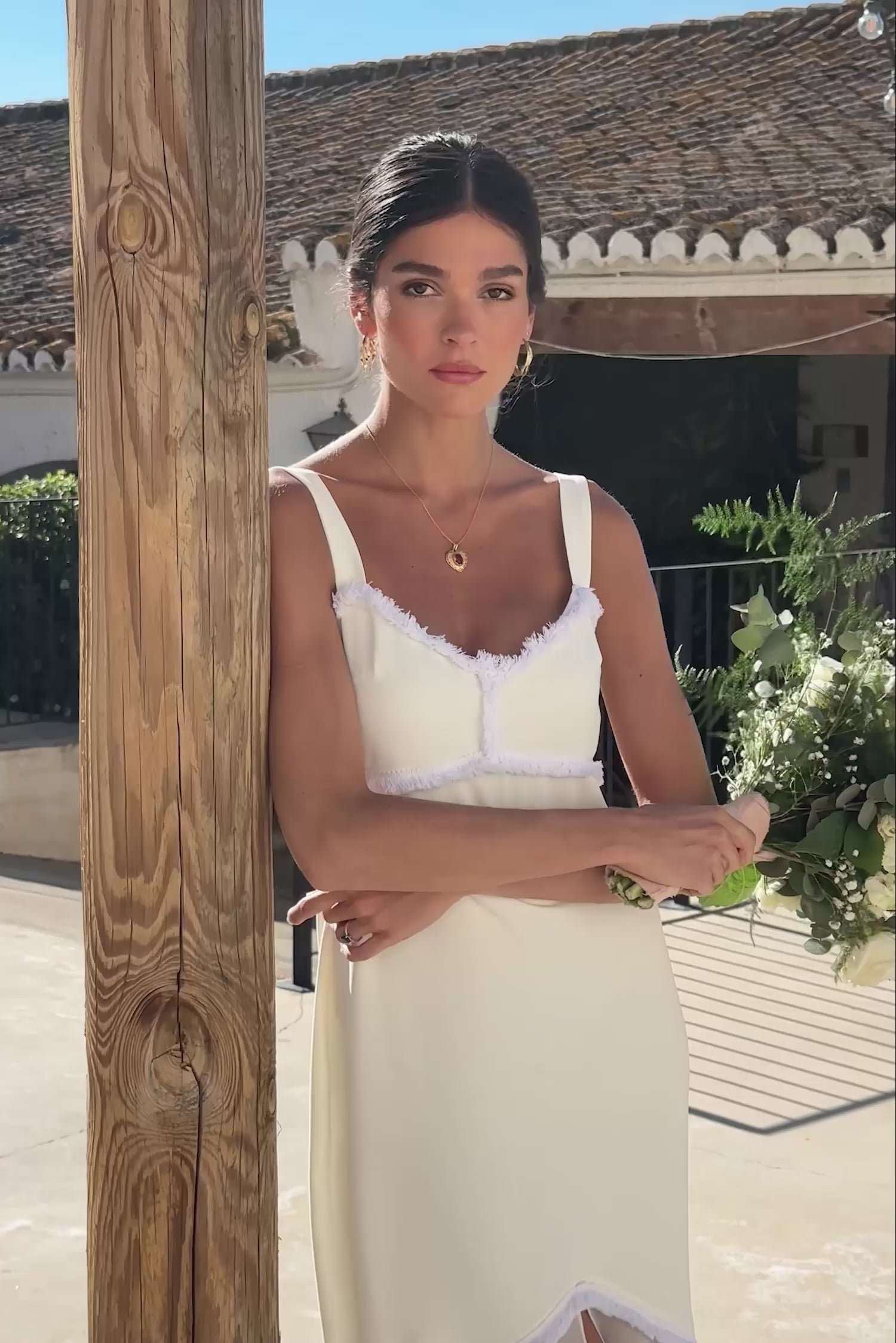 Vestido largo en tejido crepe. Escote corazón, combinado con gasa en el bajo y detalle de flecos a tono.
