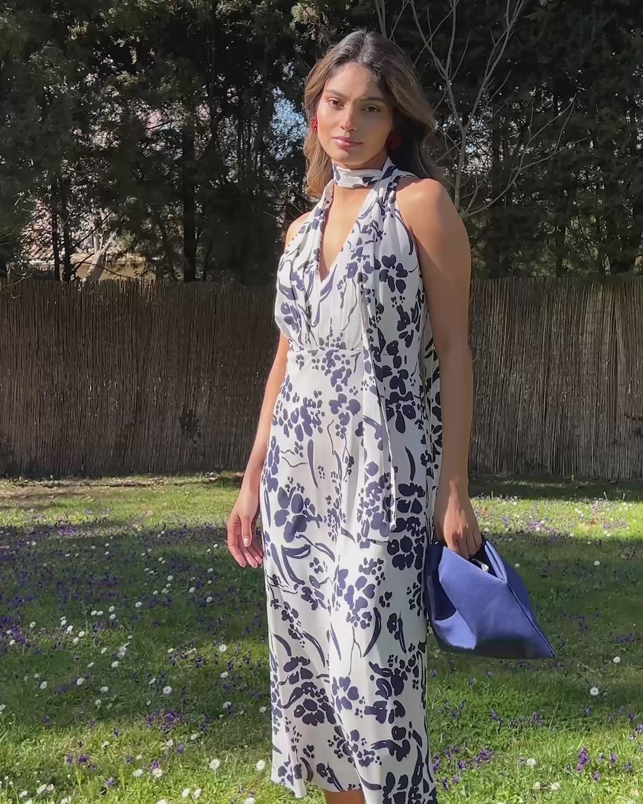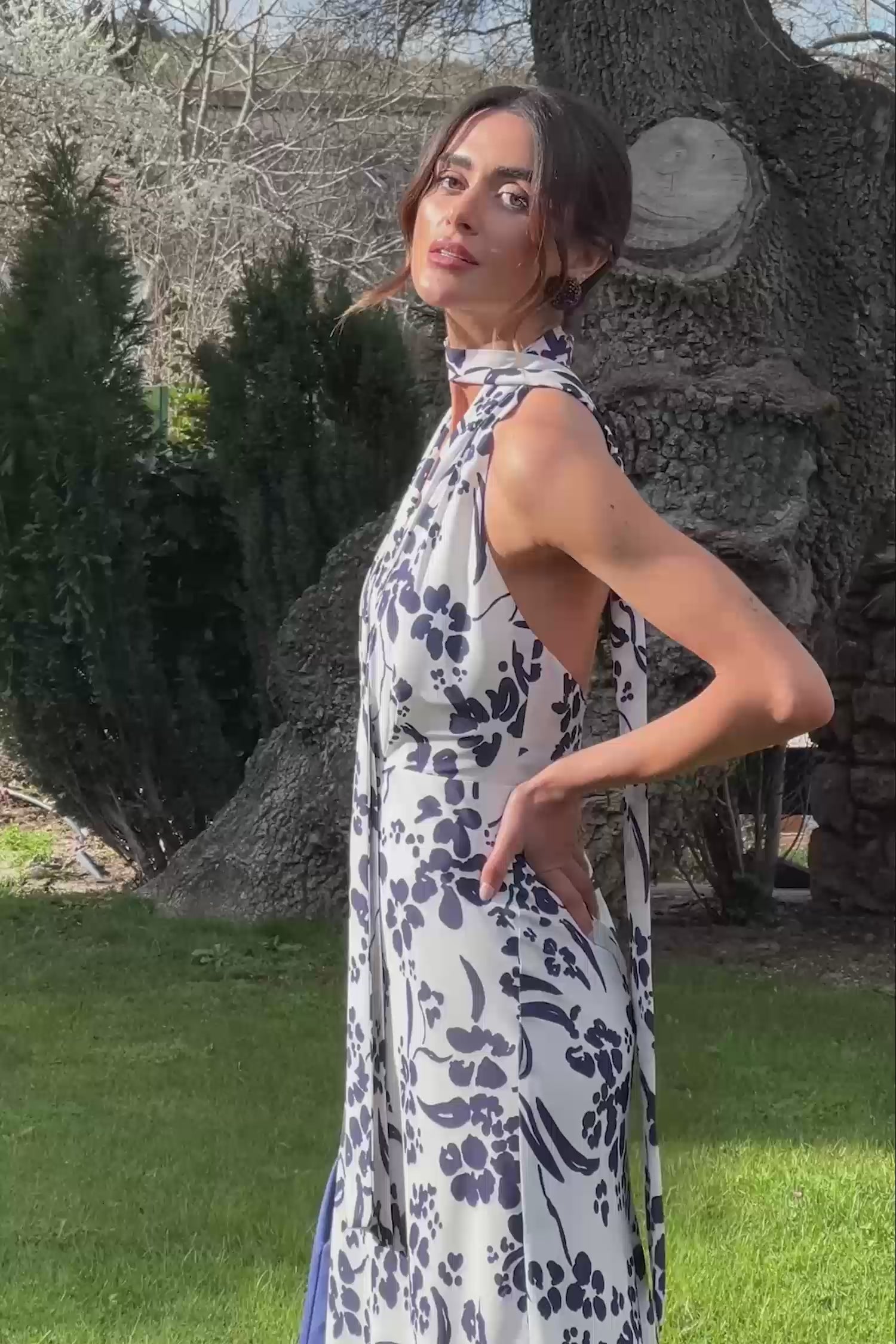 Vestido halter con escote a pico y falda evasé. Detalle de corbata al cuello