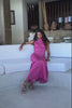 Vestido largo fluido satinado. Cuello halter y espalda abierta y caída. Fajín en cintura. Abertura lateral en falda.