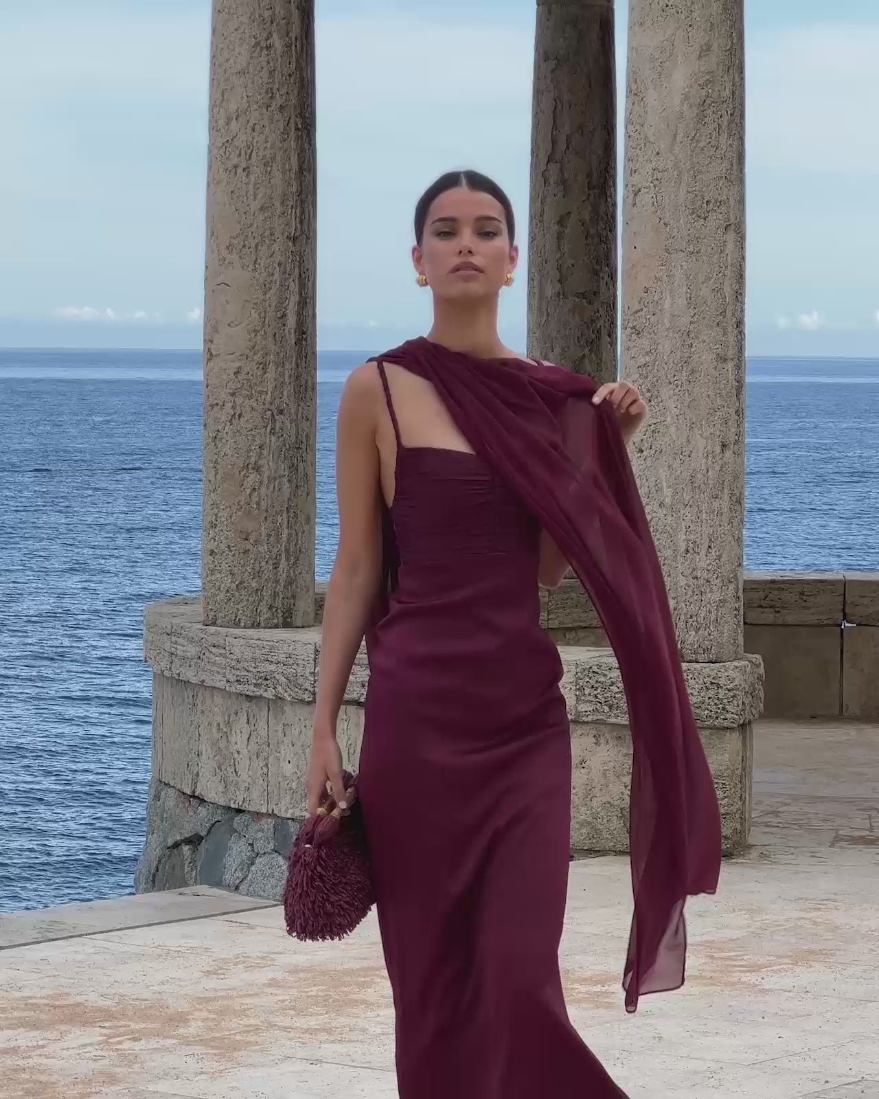 Vestido largo con detalle de frunces en la parte superior y tirantes finos. Espalda descubierta con detalle de frunces.